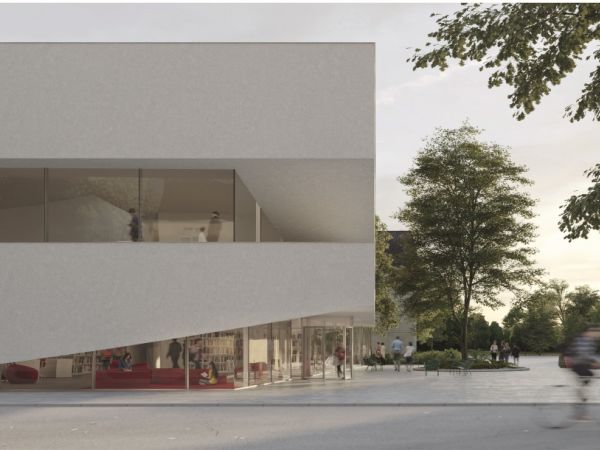 Voulu comme un lieu central et identifiable, le bâtiment se définit par une géométrie épurée, élaborée et piquetée de transparences. Quatre façades blanches qui ne forment pas un rectangle parfait mais qui sont toutes accessibles, permettant ainsi de faire le tour de la médiathèque. On pense aux origamis, ces pliages de papier japonais grâce aux plis et aux rabattements imaginés par le cabinet d’architectes. Les salles de lecture sont visibles et sont une invitation à entrer dans la structure. L’entrée principale placée astucieusement permettra de capter les flux d’usagers venus de l’esplanade de l’Hôtel de Ville et ceux provenant du tramway. Sur deux niveaux, la future médiathèque proposera des univers différents mais qui permettront néanmoins les rencontres, les échanges et favoriseront ainsi le vivre ensemble. Avec ses espaces fluides et modulables, sans poteau, le bâtiment pourra accueillir des aménagements intérieurs astucieux et adaptés, comme l’escalier qui devient gradin pour des animations en intérieur. Les vues sur l’extérieur sont généreuses, le premier étage accueillera notamment un grand balcon accessible aux usagers.